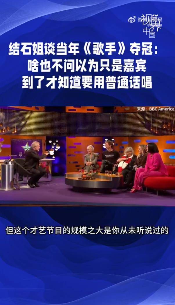 更让她和现场外国嘉宾惊掉下巴的是节目的规模:每周5亿观众观看,总决赛观众竟高达12亿。结石姐形容那段经历“改变了我的人生”,是最不可思议的奇遇。