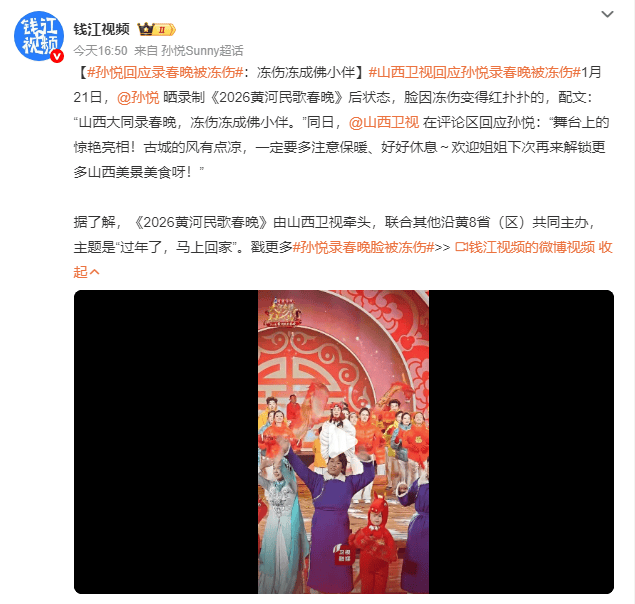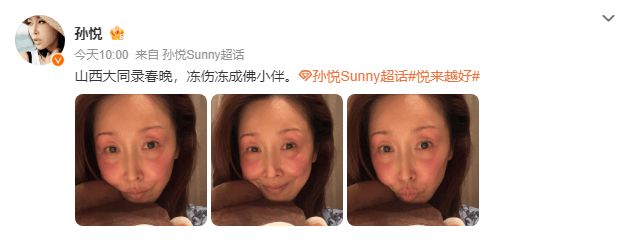 1月21日,孙悦晒录制《2026黄河民歌春晚》后状态,脸因冻伤变得红扑扑的,配文:“山西大同录春晚,冻伤冻成佛小伴。”