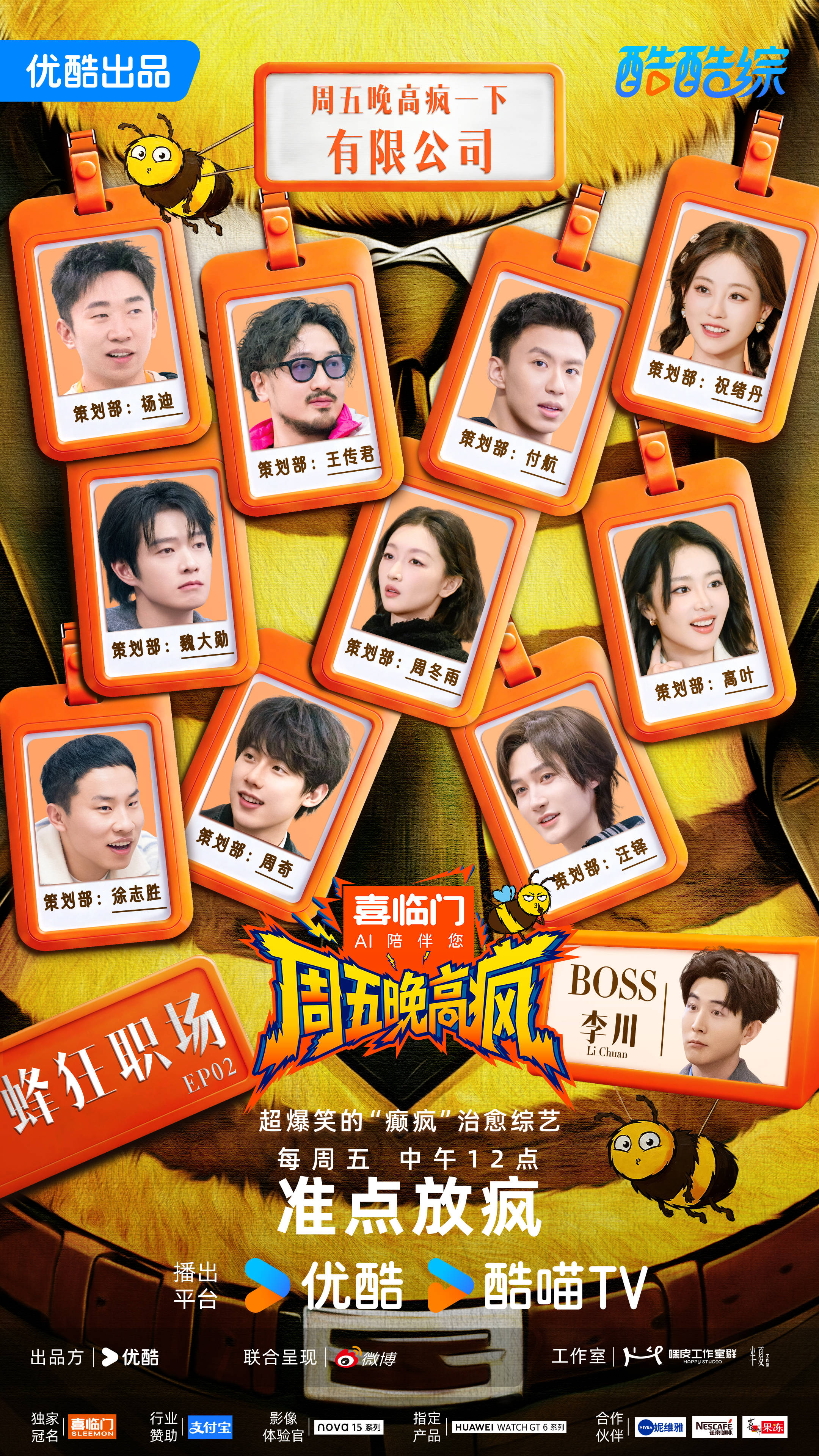 2月13日中午12点,由优酷出品、喜临门独家冠名的超爆笑“癫疯”治愈综艺《周五晚高疯》第二期节目正式上线,会员抢先看。上周播出的首期节目,每位嘉宾尽情释放自我,展现了自己的全新Bee面。在最新一期节目里,“Bee疯糖”家族付航、高叶、王传君、汪铎、魏大勋、杨迪、周冬雨、周奇、祝绪丹(按姓名拼音首字母排序)和当期嘉宾徐志胜在天津街头大巴车上各种花式“饭撒”宣传节目,还一同来到周五晚高疯一下有限公司,体验周一到周五的职场生活,接受来自“老板”李川的重重考验。