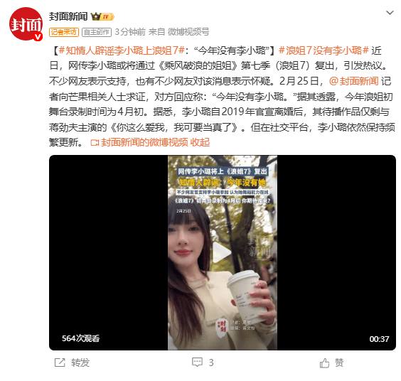 近日,网传李小璐或将通过《乘风破浪的姐姐》第七季(浪姐7)复出,引发热议。不少网友表示支持,也有不少网友对该消息表示怀疑。2月25日,封面新闻记者向芒果相关人士求证,对方回应称:“今年没有李小璐。”据其透露,今年浪姐初舞台录制时间为4月初。据悉,李小璐自2019年官宣离婚后,其待播作品仅剩与蒋劲夫主演的《你这么爱我,我可要当真了》。但在社交平台,李小璐依然保持频繁更新。