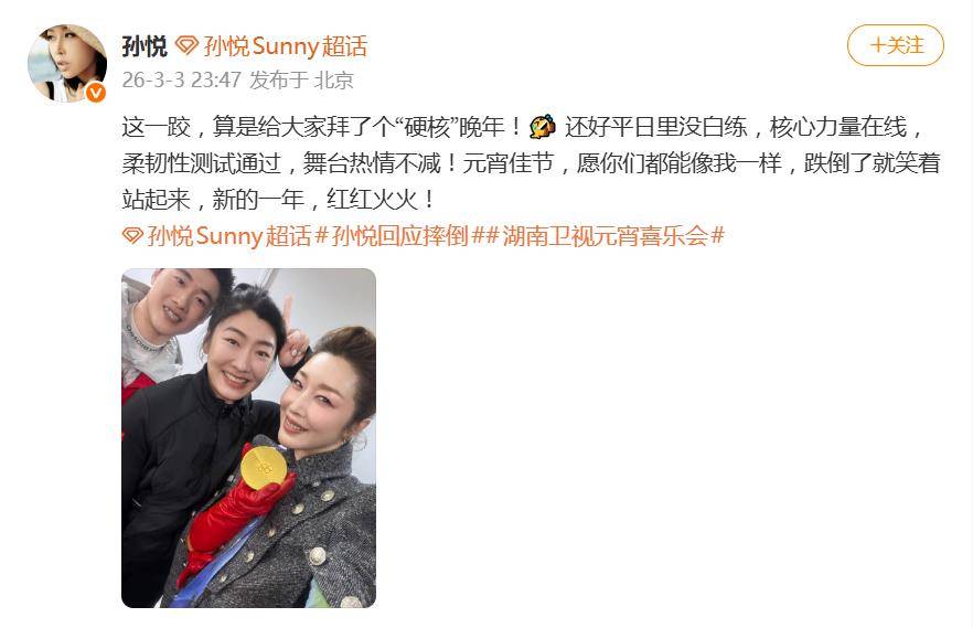 晚会结束后,3月3日深夜,孙悦在社交媒体上的幽默回应更是将好感度拉满。她发文自嘲道:“这一跤,算是给大家拜了个‘硬核’晚年!”并透露全凭平日坚持锻炼积累的“核心力量”和柔韧性,才能迅速化险为夷。她将意外巧妙转化为元宵祝福,鼓励大家“跌倒了就笑着站起来”,并祝愿所有人新的一年“舞台热情不减”、“红红火火”。